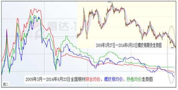 底線的提高,勢必助推中國經(jīng)濟(jì)大勢呈現(xiàn)前低后高的走勢。而經(jīng)過長期低迷的中國鋼材市場,也已經(jīng)具備逐漸走強(qiáng)的兩大要素:一是鋼市走強(qiáng)的外在環(huán)境趨好(見上圖一)。包括上半年推出一系列微刺激效應(yīng)逐漸顯現(xiàn),下半年由于經(jīng)濟(jì)增長底線提高,以及持續(xù)加推的動(dòng)力措施等合成發(fā)酵,定會形成遠(yuǎn)比上半年良好的鋼市發(fā)展環(huán)境;二是鋼市走強(qiáng)的內(nèi)在動(dòng)能充沛(下圖二)。鋼材價(jià)格經(jīng)過長期下跌后,已經(jīng)下穿了所有的技術(shù)阻力位,使業(yè)內(nèi)根本無法從技術(shù)面進(jìn)行詮釋。但從價(jià)值規(guī)律、市場規(guī)律以及基本面情況看,目前鋼材價(jià)格的底部特征已經(jīng)十分明顯,空方量能也已近衰竭。因此,經(jīng)過短時(shí)間的整固蓄勢后,震蕩上揚(yáng)應(yīng)該是后期運(yùn)行的主基調(diào)。如果再結(jié)合宏觀上經(jīng)濟(jì)增長底線的提高,下半年鋼材價(jià)格恢復(fù)性上揚(yáng)既在情理之中,也是勢所必然。所以,基于經(jīng)濟(jì)和鋼市大勢筆者作出,下半年全國鋼材價(jià)格勢必高于上半年的預(yù)測。
