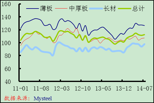 7月份德國中間商庫存小幅回升,在產(chǎn)量環(huán)比下降和凈出口環(huán)比持平的情況下,庫存上升表明鋼材需求明顯萎縮。分品種來看,薄板庫存小幅下降,而長(zhǎng)材和中厚板庫存上升明顯。