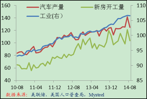 從下游行業(yè)看,8月份美國經(jīng)濟(jì)強(qiáng)勁增長(zhǎng)態(tài)勢(shì)放緩,季節(jié)性因素可能是主因,但從同比增速看,美國經(jīng)濟(jì)強(qiáng)勁增長(zhǎng)趨勢(shì)可能將放緩。8月份汽車產(chǎn)量同比增長(zhǎng)4.5%,環(huán)比下降11.7%;工業(yè)產(chǎn)出同比增長(zhǎng)4.8%,環(huán)比下降0.1%;新房開工量同比增長(zhǎng)8%,環(huán)比下降14.4%。
