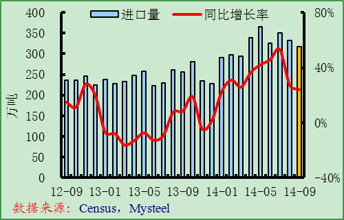 8月份美國鋼材進(jìn)口量為333萬噸,同比增長(zhǎng)27.4%,但環(huán)比下降5%。分品種看,與去年8月份相比,主要品種進(jìn)口量均實(shí)現(xiàn)增長(zhǎng),依然是冷軋、鍍鋅板與中厚板的進(jìn)口量增長(zhǎng)最明顯,其中中厚板增長(zhǎng)114%,冷軋?jiān)鲩L(zhǎng)65.7%,鍍鋅板增長(zhǎng)46.1%。與今年7月份比,除半成品、長(zhǎng)材、線材和螺紋鋼進(jìn)口量環(huán)比增長(zhǎng)外,其他品種均環(huán)比下降,其中螺紋鋼增長(zhǎng)最快,為191.5%。最新的統(tǒng)計(jì)數(shù)據(jù)顯示,截至到2014年9月24日,9月份美國鋼材進(jìn)口許可證數(shù)為317萬噸,高于去年9月水平,與8月份同期數(shù)據(jù)基本持平,預(yù)計(jì)今年9月份美國鋼材進(jìn)口量同比仍將大幅增加,環(huán)比基本持平或略有增長(zhǎng)。