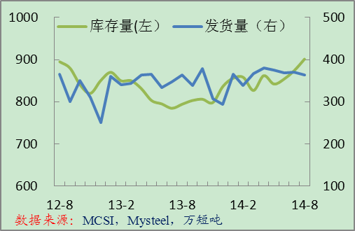 8月末美國金屬服務(wù)中心的鋼材庫存達(dá)到901.4萬短噸,環(huán)比增長(zhǎng)3.1%,同比增長(zhǎng)13.5%,創(chuàng)兩年來最高水平。8月份美國服務(wù)中心的發(fā)貨量為364萬短噸,同比略微增長(zhǎng),環(huán)比下降1.7%。按照供應(yīng)天數(shù)計(jì)算,8月末的鋼材庫存為2.5個(gè)月供應(yīng)量,7月末為2.4個(gè)月供應(yīng)量。2013年8月末為2.2個(gè)月供應(yīng)量。