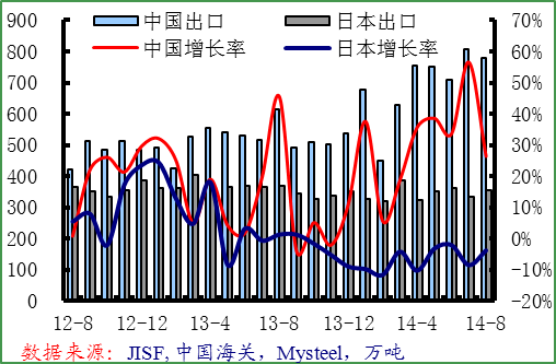 8月份中國鋼材出口778萬噸,同比增長(zhǎng)26.4%,環(huán)比下降3.7%。9月份中國鋼材市場(chǎng)大幅下滑,鋼材出口進(jìn)一步增強(qiáng),PMI調(diào)查也顯示出口訂單增長(zhǎng),預(yù)計(jì)9月份中國鋼材出口依然保持在高水平。8月日本鋼鐵出口量為356萬噸,同比下降3.8%,環(huán)比增長(zhǎng)6.7%,主要是日元貶值帶動(dòng)。9月份日元大幅貶值,日本鋼材出口競(jìng)爭(zhēng)力再次加強(qiáng),預(yù)計(jì)出口量將繼續(xù)環(huán)比增長(zhǎng)。