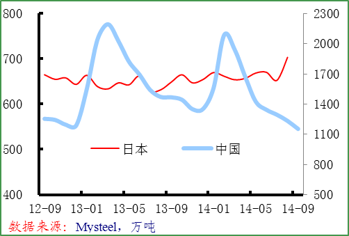 9月份中國流通環(huán)節(jié)鋼材庫存繼續(xù)下降,9月底全國主要鋼的社會(huì)庫存為1154萬噸,比8月底下降80萬噸,較去年同期下降314萬噸,鋼廠價(jià)格大幅下滑,貿(mào)易商加大了去庫存力度。中鋼協(xié)統(tǒng)計(jì)數(shù)據(jù)顯示,9月中旬末重點(diǎn)鋼企鋼材庫存為1590萬噸,較8月中旬末增長(zhǎng)65萬噸,全國重點(diǎn)鋼廠鋼廠庫存連續(xù)兩個(gè)月增長(zhǎng)。日本國內(nèi)庫存大幅上升,8月末全國鋼材庫存為703萬噸,創(chuàng)10年來最高水平,鋼廠庫存增長(zhǎng)明顯,市場(chǎng)需求難以消化供應(yīng)。