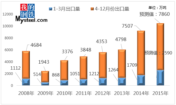 筆者通過對(duì)比近8年國(guó)內(nèi)鋼材出口量走勢(shì)規(guī)律發(fā)現(xiàn),1-3月份國(guó)內(nèi)鋼材出口量占全年的比重在20%左右,2015年1-2月份國(guó)內(nèi)鋼材出口量受到特殊原因影響或被放大,2015年1-3月份鋼材出口量或達(dá)到2590萬噸。倘若拋出500-600萬噸額外增加的出口量,2015年前三個(gè)月鋼材出口量也接有2000萬噸左右,全年鋼材出口量有望突破1億噸大關(guān)。
