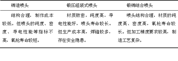 因為拉瓦爾孔型具有比較高的射流速度,所以氧槍噴頭一般都采用拉瓦爾孔型。為了便于制作擴(kuò)張段,均簡化為圓錐形。在最近幾年的不斷進(jìn)化中,甚至還出現(xiàn)了“突擴(kuò)”、“旋轉(zhuǎn)”等特殊孔型。按氧槍噴頭的制造方法,氧槍可分為鑄造噴頭、鍛壓組裝式噴頭及鍛鑄結(jié)合噴頭,三種噴頭特點(diǎn)下表所示。