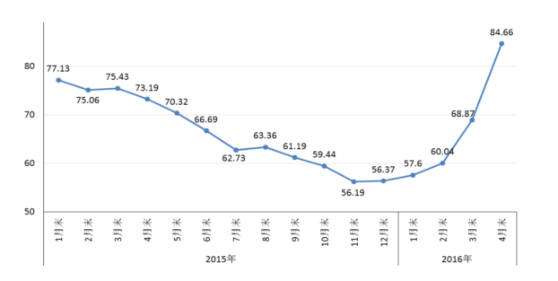 4月末,鋼鐵協(xié)會(huì)CSPI中國(guó)鋼材價(jià)格指數(shù)為84.66點(diǎn),環(huán)比上升15.79點(diǎn),升幅為22.93%,較上月加大8.22個(gè)百分點(diǎn),連續(xù)5個(gè)月環(huán)比上升;同比上升11.47點(diǎn),升幅為15.67%。(見(jiàn)下圖)