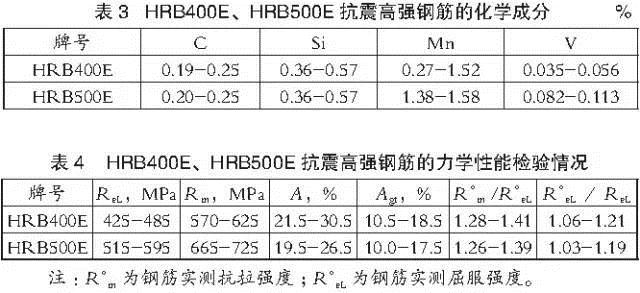 我國(guó)在GB 1499.2-2007標(biāo)準(zhǔn)中首次將鋼筋的抗震性能指標(biāo)納入國(guó)標(biāo)中,并規(guī)定了抗震鋼筋的三個(gè)代表性指標(biāo):強(qiáng)屈比(R?m /R?eL)、超屈比(R?eL/ReL)和最大力總伸長(zhǎng)率(Agt)。國(guó)內(nèi)某鋼廠HRB400E、HRB500E抗震鋼筋多樣品檢驗(yàn)獲得的化學(xué)成分和力學(xué)性能指標(biāo)見(jiàn)表3和表4。