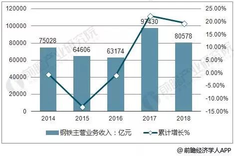 據(jù)前瞻產(chǎn)業(yè)研究院發(fā)布的《中國鋼鐵行業(yè)發(fā)展前景與投資戰(zhàn)略規(guī)劃分析報(bào)告》指出,2018上半年中國鋼鐵行業(yè)主營業(yè)務(wù)收入達(dá)到30525億元,累計(jì)增長15.8%?;仡?012-2017年鋼鐵行業(yè)營業(yè)收入情況:近六年來,我國鋼行業(yè)營業(yè)收入較為穩(wěn)定,2015年以來累計(jì)增長率逐漸回暖。中國鋼鐵行業(yè)將繼續(xù)保持穩(wěn)中有長趨勢,預(yù)計(jì)2018年中國鋼鐵行業(yè)營收將突破80000億元。