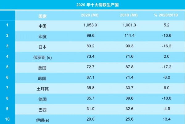 2020年十大鋼鐵生產(chǎn)國(guó)