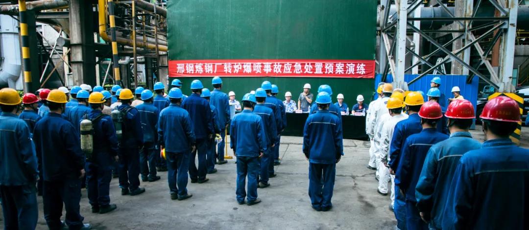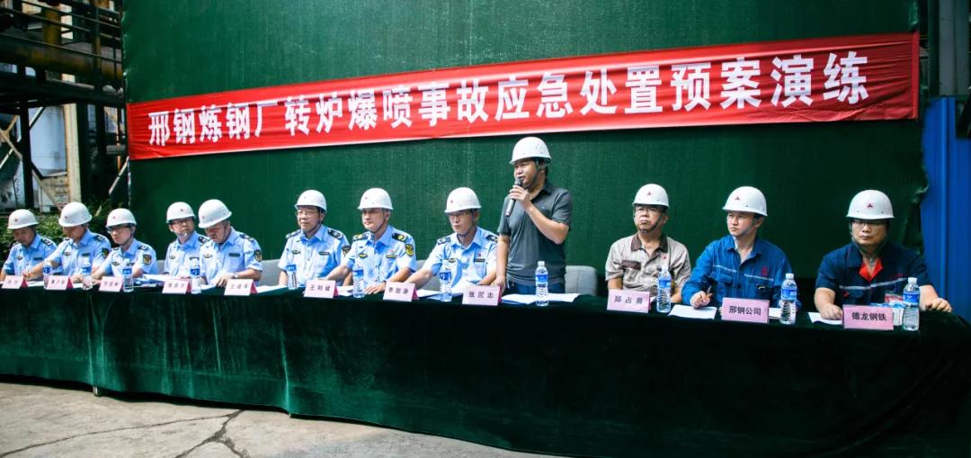 隨后,參會(huì)人員一起現(xiàn)場觀摩了邢鋼高溫熔融金屬爆噴事故現(xiàn)場應(yīng)急處置演練。本次演練,模擬煉鋼廠加料跨天車向2#轉(zhuǎn)爐加廢鋼時(shí)發(fā)生爆噴為背景,演示了事故上報(bào)、安全疏散、預(yù)案啟動(dòng)、現(xiàn)場搶險(xiǎn)、應(yīng)急救援等環(huán)節(jié)。